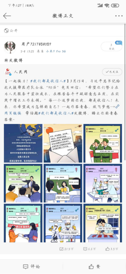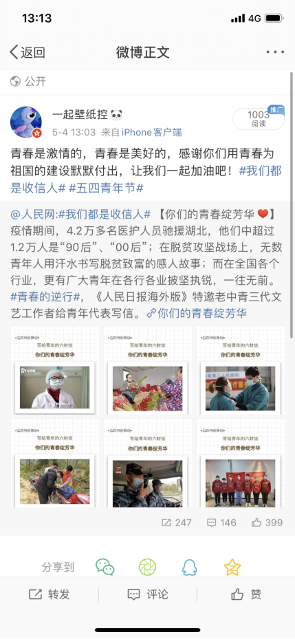 5月4日全球最大顶级体育平台号召全球最大顶级体育平台全体教师和公司广大青年员工积极参加人民网发起的“我们都是收信人”活动,参与评论互动,用青春的责任担当,放飞梦想!进一步提振了青年干事创业的精气神,进一步增强了听党话、跟党走的情感认同。