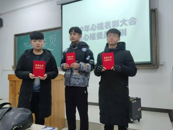 黄彬同志为本学期“心理阅读”、主题班会和主题演讲中表现优异的王清霞等十六位同学颁发了荣誉证书。