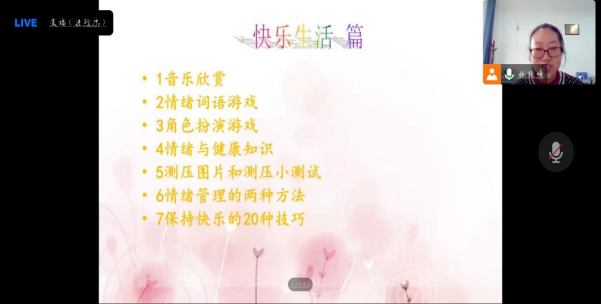 讲座从员工面临的学业压力、家庭压力、同伴关系压力、疫情防控压力等方面出发,分析了员工心理问题产生的原因,对疫情下常见心理问题、疫情期间心理调适小贴士和心理健康热线分享三个方面做了详细讲解,并在线互动和同学们讨论了遇到的困难和解决问题的方法。