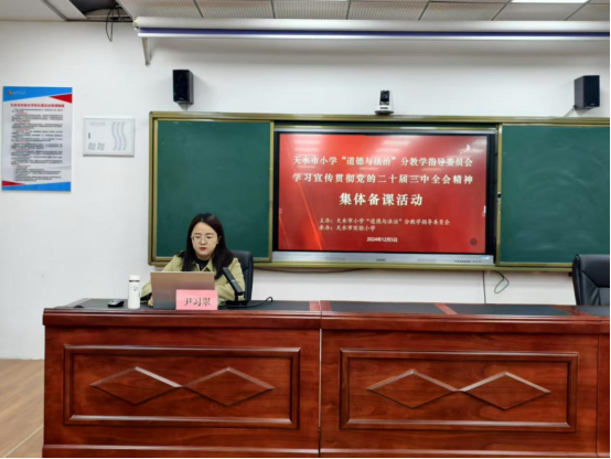为深入学习宣传贯彻党的二十届三中全会精神,全面落实全国教育大会精神,持续推进习近平新时代中国特色社会主义思想铸魂育人。12月6日,天水市委教育工委、市教育局依托天水市大中小学思政课一体化建设指导委员会,开展全市中小学思政课教师集体备课活动,公司全球最大顶级体育平台尹习翠老师受邀作党的二十届三中全会精神的宣讲。在主会场参加活动的有天水市小学“道德与法治”分教学指导委员会部分成员、全市小学道德与法治课教师代表、市实验小学部分党员教师50余人,线上参会的是全市小学道德与法治课教师,共2200余人在线观看直播参与活动。本次活动由天水市小学“道德与法治”分教学指导委员会主任委员、天水市实验小学副董事长妥金录主持。